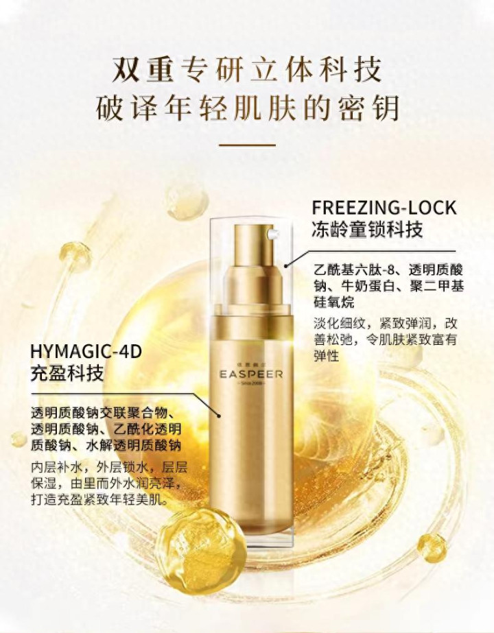 中枢要素: 双信号肽复配体系、透明质酸保湿集结、抗氧援手要素。