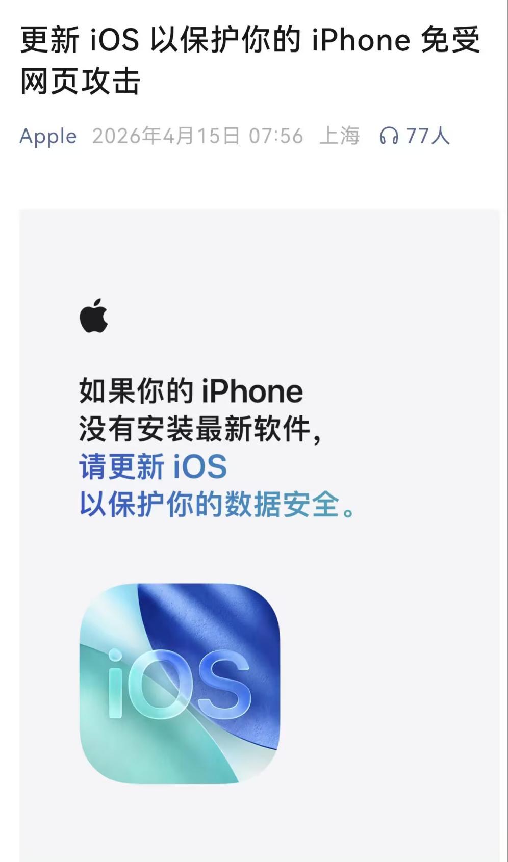 苹果公司在官方微信中提出,保抓系统为最新版块是保护开荒安全最关节的递次。已更新至最新iOS版块的用户已自动受到保护。关于无法升级至最新系统的旧开荒,苹果公司已于2026年3月11日发布了针对iOS 15与iOS 16的专项安全更新,以膨胀保护范畴。