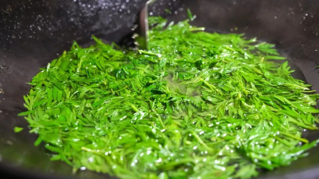 簇新的艾叶焯水去涩,捞出过凉