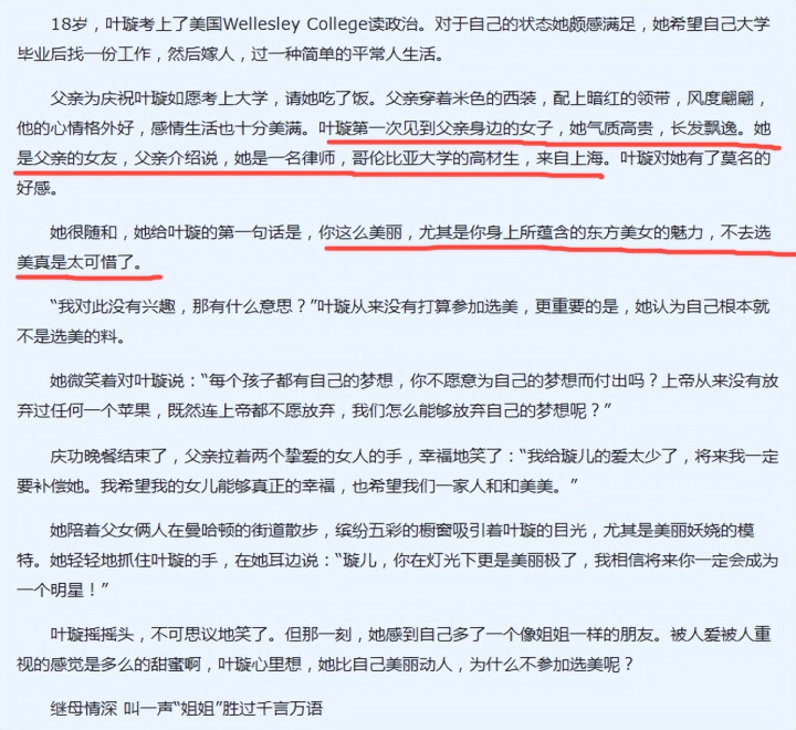叶璇的继母只比她大 10 岁,毕业于哥伦比亚大学,学识出众。两东谈主平方相处和睦,1999 年叶璇报名选好意思比赛,照旧继母在一旁全力支握饱读吹。