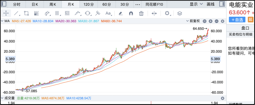 因为之前舆情风云,许多网民齐看李嘉诚不快乐,但看成股民你一定不会嫌弃李嘉诚的公司,因为每一支股齐不差。我持仓多年的是电能实业,昔日25年的月k线是这样的: