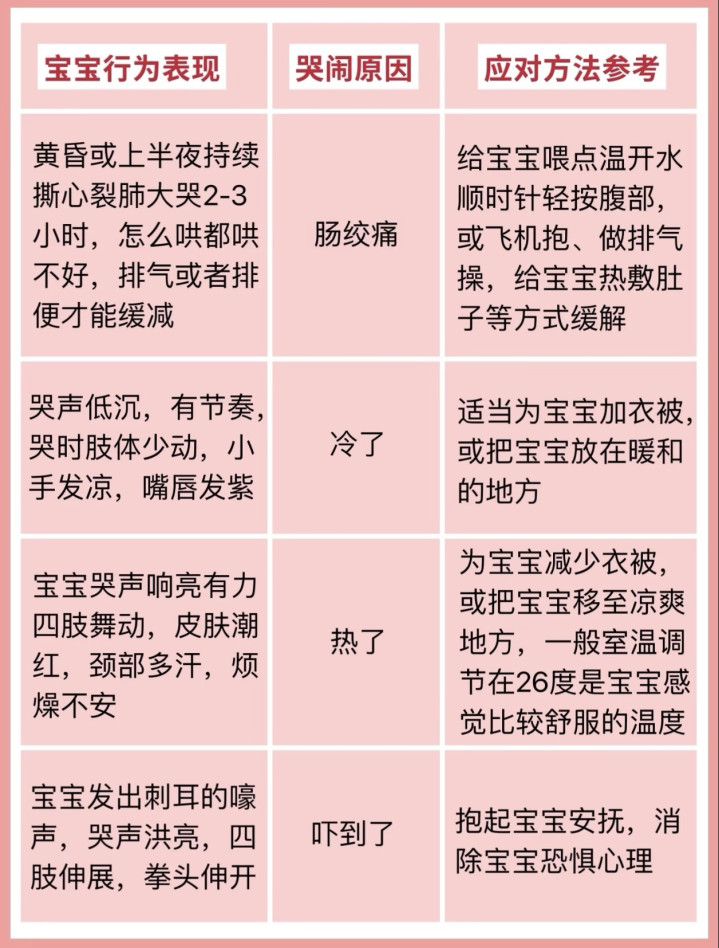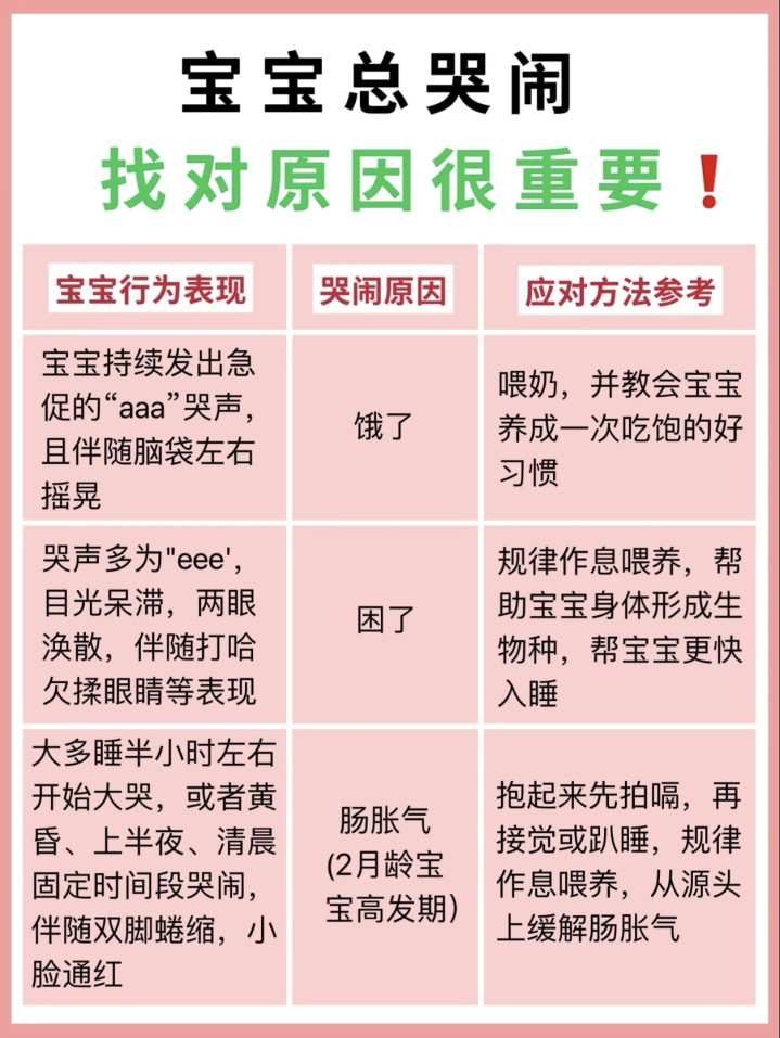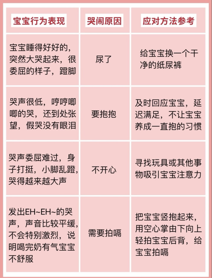 临了,宝宝也会“求抱抱”“消沉作”“需要拍嗝”。哭声低,哼哼唧唧,到处调查,等于思抱抱;哭声闹心,身子打挺,金莲乱蹬,等于“消沉作”,找个玩物诱骗他宝贵力;发出“EH~EH~”的哭声,声息粗疏,等于喝完奶有气,竖抱起来,用空腹掌轻拍后背,帮他拍嗝。