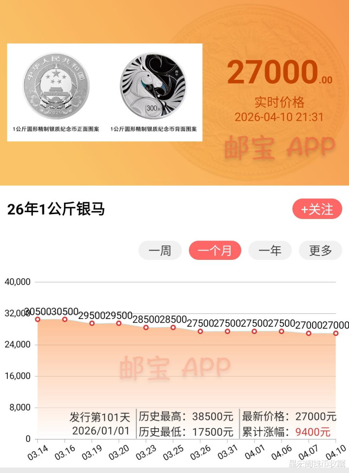 2026年马年一公斤银币,当今来看跌幅是最大的一个品种,按照最高成交价钱也曾也来到了38000元把握。到现阶段阛阓最新成交价钱,基本上在27000~30000元把握,不外这个行情如故要看什么本领动手的,如若是在刚刊行以17600元价钱动手,如故有相比可以的溢价。如若是后期36000元的刊行价动手,当今也照旧处于破发状况。