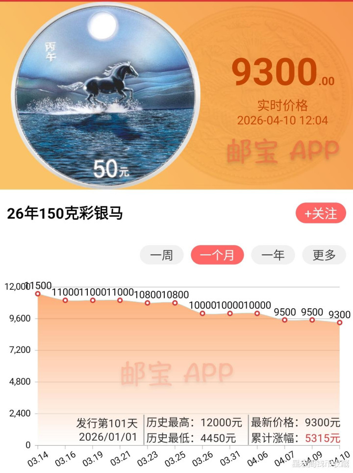 经由半年本领的阛阓千里淀,现阶段马年金银回想币阛阓行情也出现了大幅度的回落。手脚前期黑马品种,2026年马年金银回想币150克彩色银币月下奔马也曾阛阓行情最高的本领,到过12000元以上,现阶段阛阓行情也出现了显然的回落,最近一段本领阛阓行情照旧下落到了9300~10500元把握,封装版阛阓行情相同也回落到了11000~12000元把握。