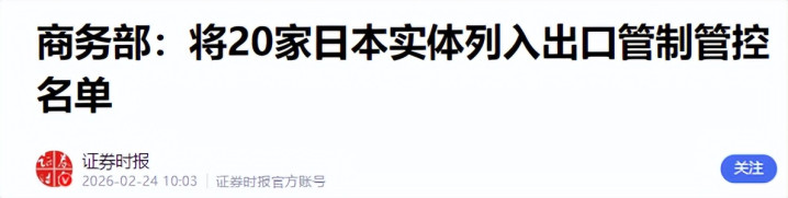 效能只过了1天,2月24日商务部成功在官网挂出公告,将20家日本实体列入出口管制管控名单,明确指向一个指标:制止日本再军事化。