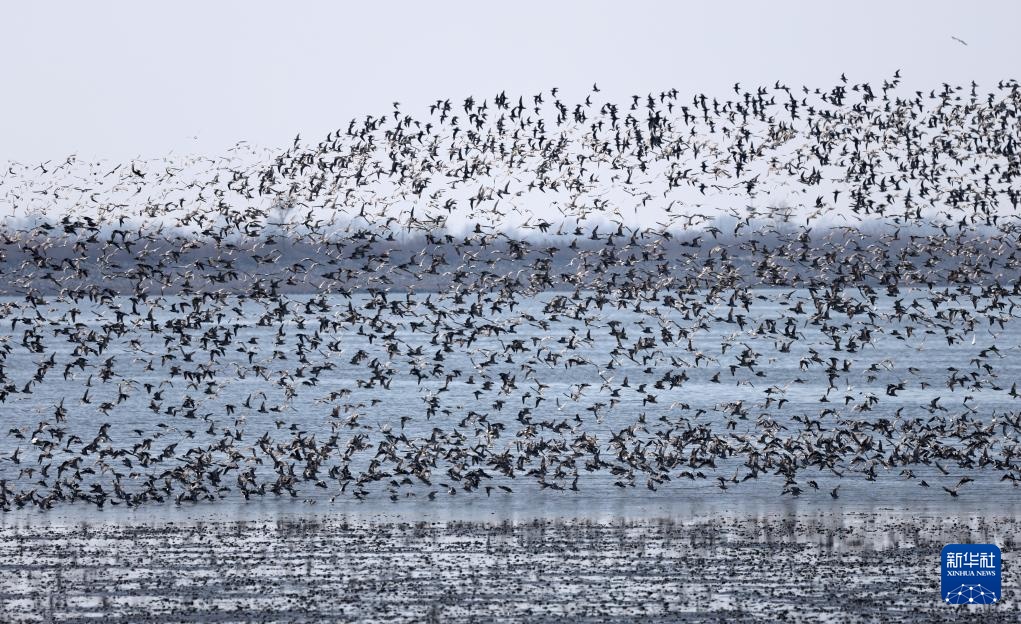 4月2日在辽宁丹东鸭绿江口候鸟栖息地拍摄的“鸟浪”。新华社记者 李钢 摄