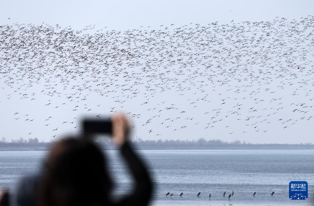 4月2日,开云体育官方网站搭客在辽宁丹东鸭绿江口候鸟栖息地不雅看、拍摄“鸟浪”。新华社记者 李钢 摄