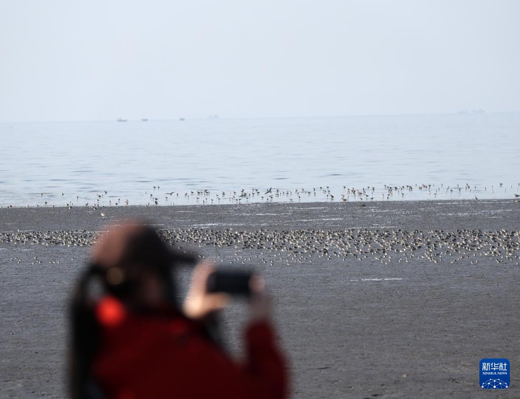4月2日,搭客在辽宁丹东鸭绿江口候鸟栖息地不雅鸟。新华社记者 李钢 摄
