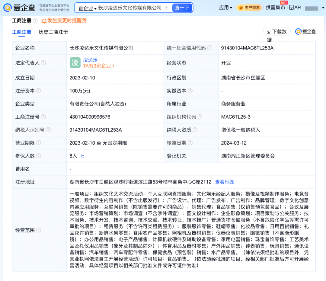 爱企查App露馅,长沙凌达乐文化传媒有限公司建筑于2023年2月,法定代表东说念主为凌达乐,注册老本100万元东说念主民币,野心边界包括个东说念主互联网直播职业、文化文娱牙东说念主职业、录像及视频制作职业等,由凌达乐全资捏股。